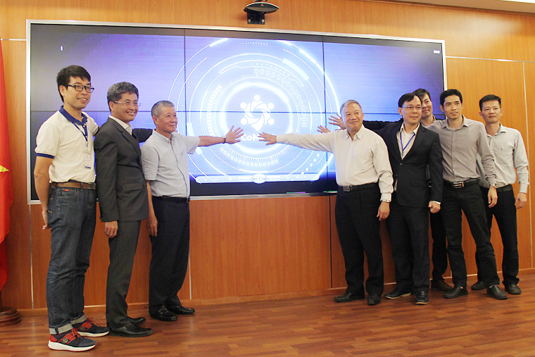 Thứ trưởng Nguyễn Thành Hưng và đại diện 6 thành viên trong Liên minh Comeet bấm nút khai trương Giải pháp Hội nghị trực tuyến Comeet